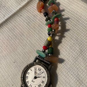 Explraess watch seven inches in length, face is 22 mm, two rows of multicolored stones, clasp for closing