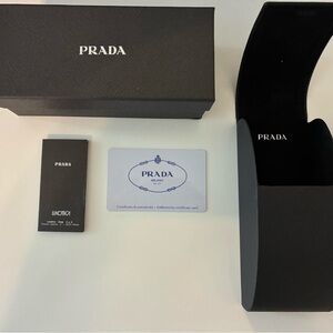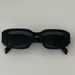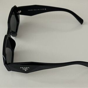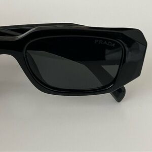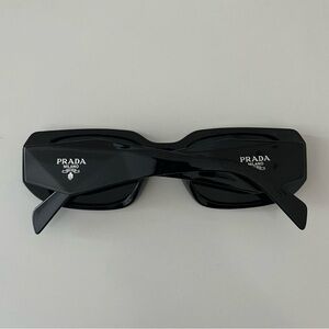 Chic Prada sunglasses with a sleek black design. Features iconic branding on the temples. Perfect for a stylish look.