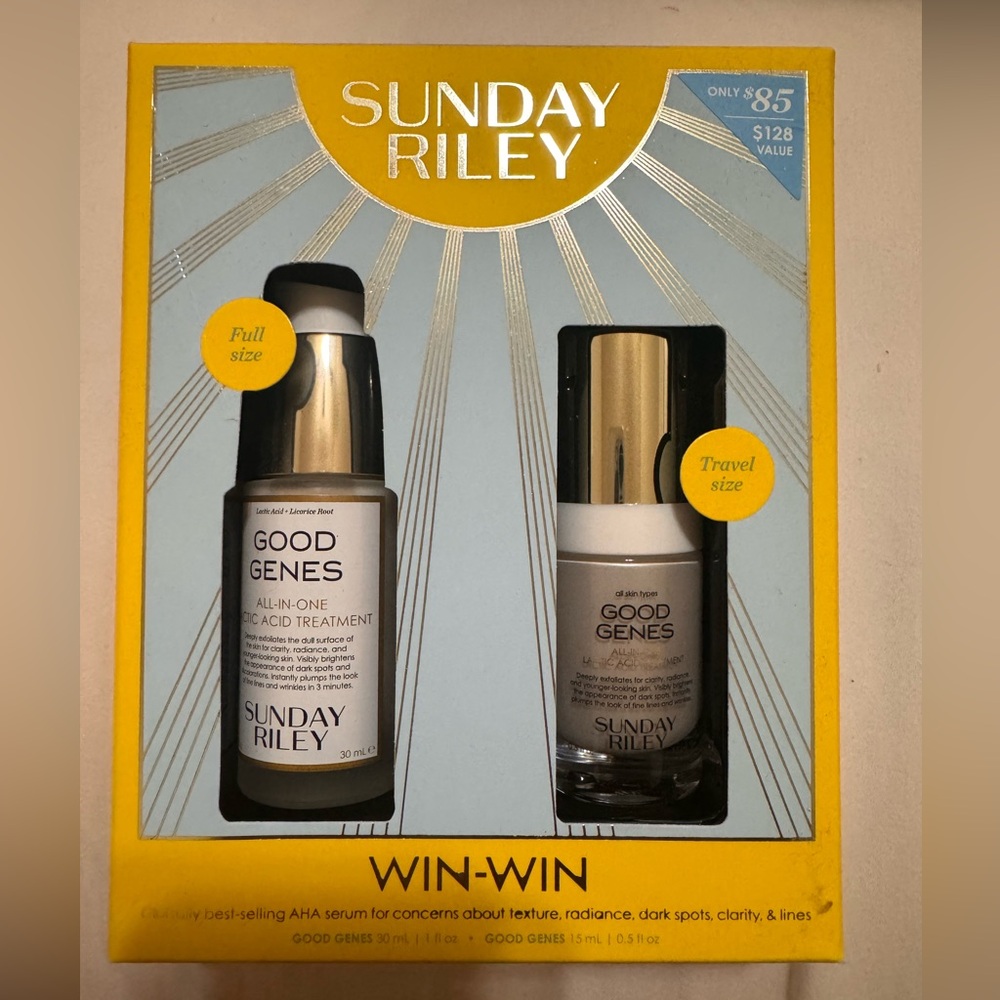 Unopened Sunday Riley good genes! Full size (1 fl oz) and travel size (0.5 to oz). Packaging seal is unopened, just have too much skincare and trying to clear out!