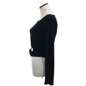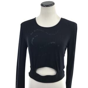 Black crop top with a front cutout from good hYOUman. Long sleeves. Pulls on. Be different on the front in a spiral pattern. Cycle bar spellout on one sleeve. Modal / spandex. Machine wash. Made in the USA. In preowned condition, some minor loose threads.