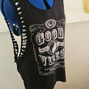 distress good vibes tank with distressed look. This top is very thin and light. great over swimsuits