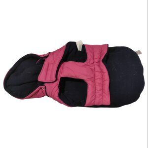 This is a dog winter snow coat made by Good2Go. The outside is bright pink and waterproof, and the inside is a navy blue and fuzzy. It has a unique closure pattern, with the body attached with velcro and the removable hood attached with snaps. It is an XS. The measurements are 13 inches long and 20-21.5 inches around (there is elastic on the part across the chest). It is in good condition, and the care instructions are hand-wash and air dry.