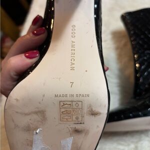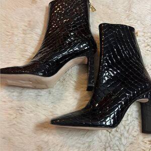 These black heeled boots from Good American feature a striking crocodile texture and a sleek stiletto heel, offering a sophisticated and luxurious look. The mid-calf height and pointed toe design add to their elegant silhouette, making them perfect for dressy occasions. The glossy finish enhances their visual appeal, reflecting light beautifully off the scaled pattern.
