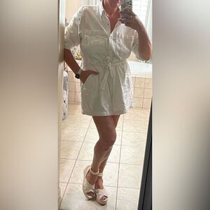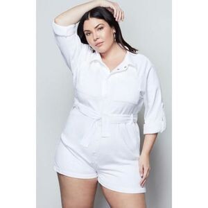 The must-have piece for summer and beyond. This romper is made with the highest quality white denim, ensuring a crisp and fresh look. The tailored fit is designed to flatter your figure and enhance your silhouette. Whether you're heading to a beach party or a brunch date, this romper is the perfect choice. The versatile white color allows you to easily dress it up or down with your favorite accessories. With its waist tie and functional pockets, it combines style with practicality. Step into the spotlight and make a statement with the Good American White Denim Romper.