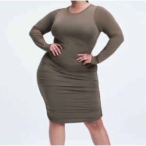 NWT Good American ruched mini-midi dress in fog/olive green size 1 (small). If you got it, flaunt it, in this ruched dress. It’s designed too show off all your curves, with side ruching for added flare. Perfect to dress up or down. TRUE Shade is hard to show online says Fog- olive green. Body conscious, tight fit. Gorgeous long sleeve dress with plenty of stretch. See photos for fabric/care tag and measurements.