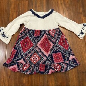 GoodLad Western Style Dress. White/red/navy. Embroidered sleeve cuff. Bandana skirt pattern. 3 buttons in back. 100% cotton. Size 18 months. Good condition!