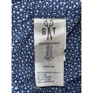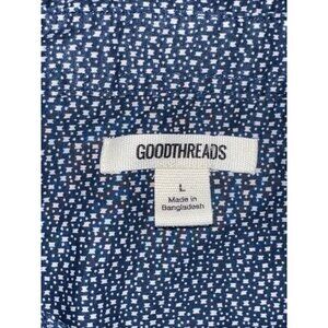 This GoodThreads button-up shirt is perfect for any woman looking to add a pop of color to her wardrobe. The blue and white geometric print is eye-catching and the cotton material ensures comfort all day long. The short sleeves and collared neckline provide a classic look, while the regular fit ensures a flattering silhouette. This shirt is perfect for any occasion and can be dressed up or down. It's available in size L and is a must-have for any fashion-forward woman.
