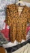 Shade of Light Orange with. black floral pattern. Ruffle details at shoulder/arm area. Elastic at Cuff.