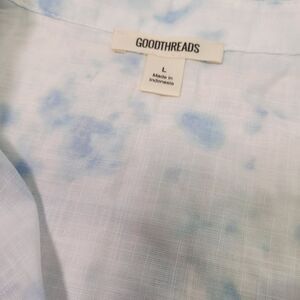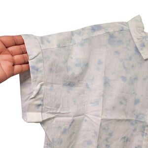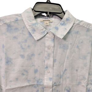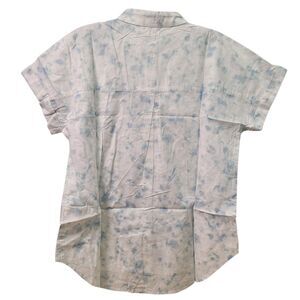 This GoodThreads Women Washed Cotton Short-Sleeve Shirt in size Large features a watercolor print, making it a stylish choice for various occasions. The collared neckline with a button closure adds a sophisticated touch to the lightweight and breathable shirt, perfect for all seasons, especially summer, fall, and spring.
