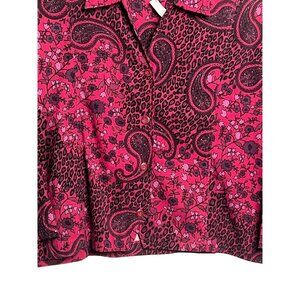 Elevate your wardrobe with this vibrant cropped shirt, featuring a bold pink and black paisley and leopard print pattern. The soft polyester/spandex blend ensures comfort, while the long sleeves and button-up design add versatility for casual or semi-formal looks.