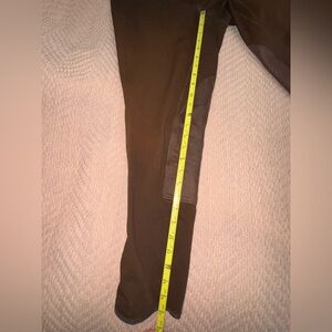 Brown performance riding breeches with stretch fabric, knee patch grip panels, belt loops, and front zip closure. Tailored fit designed for comfort and movement in the saddle. Back zip pocket. Excellent pre-owned condition.
