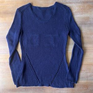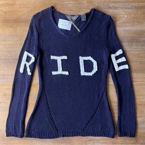Chic navy scoop neck sweater. Features bold white RIDE lettering. Ideal for casual wear. Worn once.
