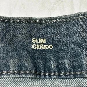 These straight leg jeans feature a full-length design and a smooth, uniform denim texture. The waistband includes a leather patch, adding a touch of style to the overall look.
