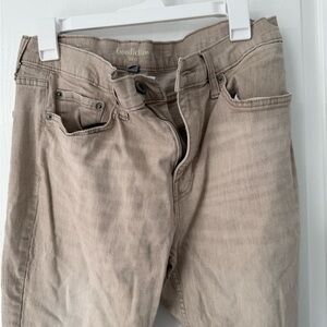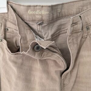 Light brown casual pants with a classic fit. Features a zip fly and button closure.