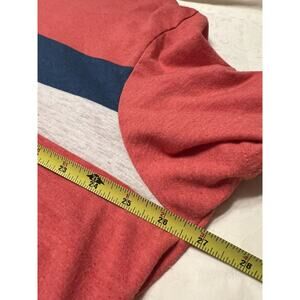 Nice red with large blue and white bands across chest cotton/poly t-shirt. Not bright red but a muted red. Mens XXL. See measurements. No flaws. Comes from smoke free home.