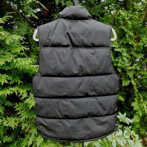 Goodfellow & Co mens black zip & snap puffer vest with front slant pockets, snap-close chest pockets, inner velcro-flap pocket, corduroy lined collar, zipper pull, locker loop, and rounded back hem