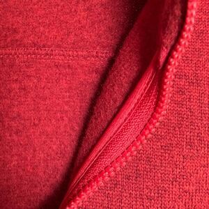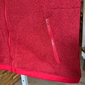 In excellent condition only wore once. Red sleeveless fleece vest features a full zipper closure, a standup collar, and two zippered hand pockets. Made of soft polyester. Outerwear collection, suitable for layering in cooler weather.
