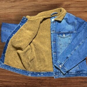 This Goodfellow & Co sherpa-lined denim jacket is brand new with tags and ready to upgrade your layering game. Sized Large and lined with warm sherpa in the body (arms are quilted), it features a soft sherpa collar and classic button front (not snaps).