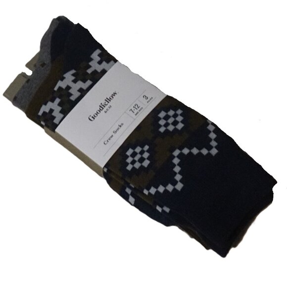 Goodfellow Crew Socks. 3 Pair. Polyester Blend. Men’s Size 7-12 Shoe Size. Gray, Navy and Olive Green Patterned. New with Tags.