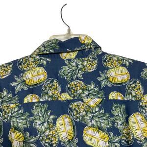 Size large Goodfellow short sleeve, button front navy blue hawaiian shirt with pineapple print. In excellent used condition. 97% cotton. 3% spandex. 42 inch chest. 27 inch length.