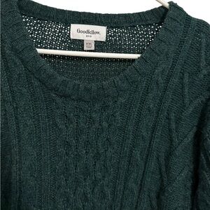 Cozy and stylish Goodfellow and Co cable knit sweater in a deep green shade. Features a classic cable knit pattern, crew neckline, and ribbed cuffs and hem for a comfortable fit. Perfect for layering in cooler weather or adding a touch of texture to any outfit.