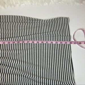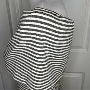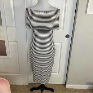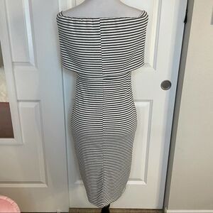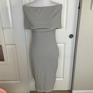 White and Gray stripe dress. Has arm holes with an off the shoulder detail.