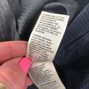 Features blue with black pinstripes, zippered closure with button, four pockets, belt loops, machine wash