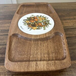 The tray features a unique design with a ceramic insert and two compartments for serving cheese, crackers, and meat. The rectangle shape and medium size make it perfect for any occasion.