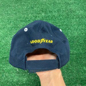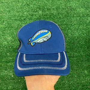 Blue and navy blue baseball cap by Goodyear with cartoon Goodyear blimp graphic and embroidered logo back hit. Stitched stripes on brim.