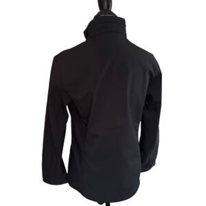 Perfect condition. Nice weight to it and will keep you dry in light weather. Jacket is lined for extra warmth. Soft shell black jacket with zip closure. Size medium shown on size 6 mannequin.