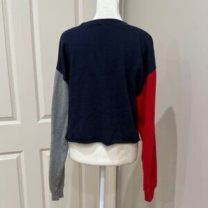 Fun colorblock sweatshirt featuring Goofy graphic. Vibrant red, gray, and navy colors.