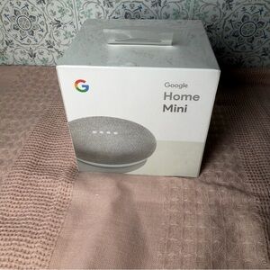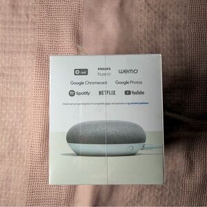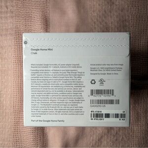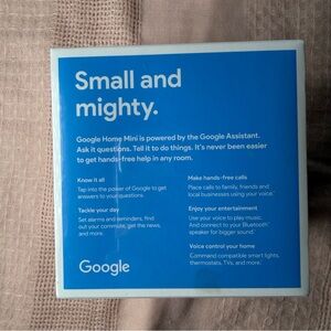 Google Assistant device packaging. Features voice command examples. Compact and informative design.