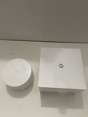 Official Google Nest WiFi router in clean white. Minimal cylindrical design with branded G logo. Clear setup sticker and ports visible.