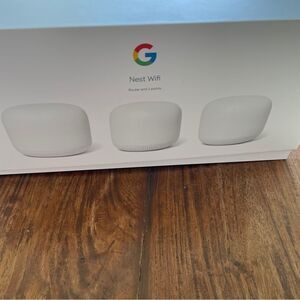 Compact Google device in white. Minimalist and functional. Unobtrusive in any decor. Please note that it is only the router, it will be packaged in the large box. Comes with electric and router cables, instructions etc. very minimal wear, please see photos! Let me know if you have any questions!