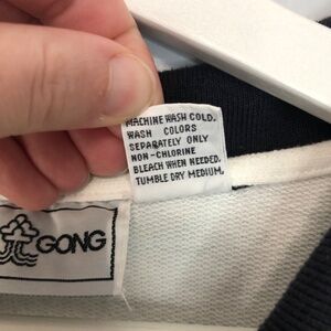Goola Gong vintage rugby sweater with wide black and white stripes and a collared neckline. Short sleeves.