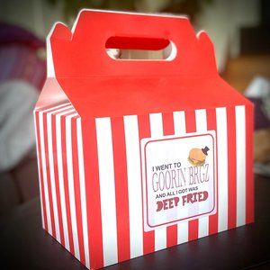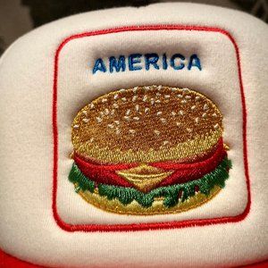 Comes in a red & white striped "to go" box. Soft front panel, snap-back style.