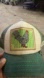 Stylish trucker hat featuring a rooster patch. Green and beige design with mesh back.