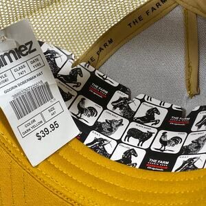 Introducing a Goorin Bros The Farm Beware Doberman trucker snapback hat in black and biege colors. This cap features a mesh back, curved brim, and adjustable snap closure, with a front patch showcasing a Doberman graphic. Item is in new condition.