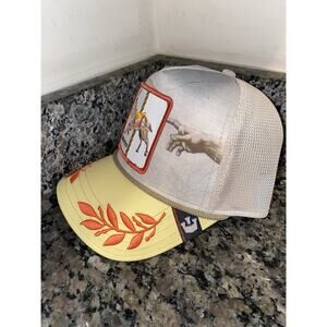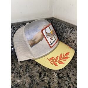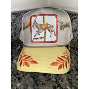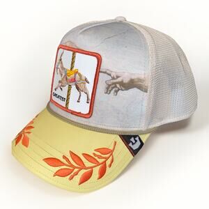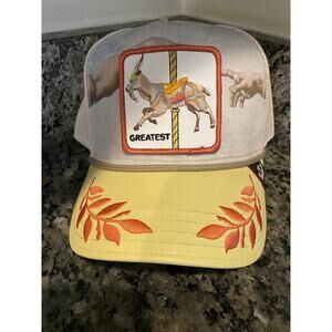 The Goorin Bros The Farm Maximum GREATEST Carousel Capsule RARE hat is a limited edition floral-patterned trucker hat made of polyester canvas material. Featuring an adjustable size and a multicolor design, this hat is perfect for various occasions such as travel, parties, or casual wear. The hat also includes a mesh back for added breathability and is lightweight in design. With its unique design elements like the Altus Equo character and animal-themed details, this hat is sure to make a statement for those who appreciate style and quality.