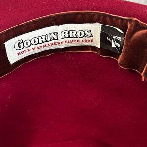 This Goorin Bros semi-floppy hat is designed for unisex adults and comes in a striking red color. Made from wool, it features a velvet band and a bow detail, making it suitable for casual occasions. Ideal for the fall season, this hat is not vintage or handmade. The condition is pre-owned.
