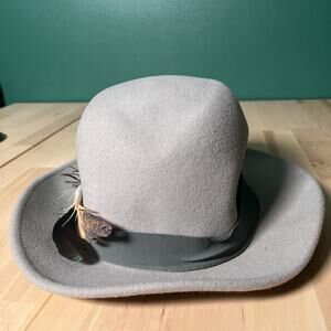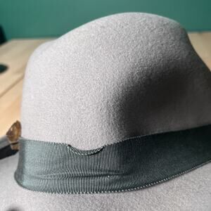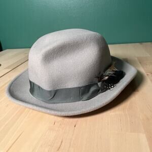 Goorin Bros fedora hat in light gray with green grosgrain ribbon and feather accent. Size XX-Large. Made in USA. 100% wool. Light wear but no major flaws. See pictures for details and measurements. Orders ship out on Monday, Wednesday, and Friday.