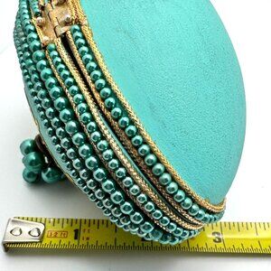 This vintage goose egg trinket box features exquisite teal pearls, gold accents, and a unique religious motif inside. A charming collectible piece.