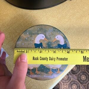 Charming tin container featuring a duck pattern. Perfect for storage or decoration. Measures about 5.5 inches tall and 4 inches across. Inside is very clean!