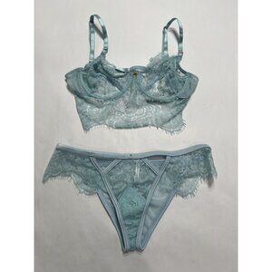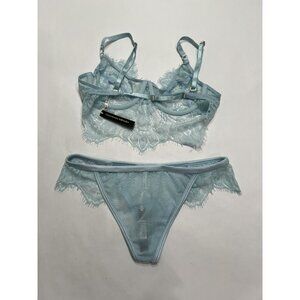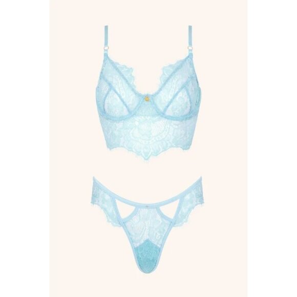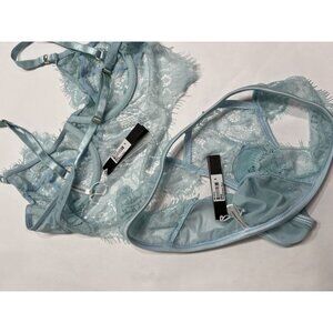 Bra: Crafted with delicate lace and featuring a stunning baby blue color, this bra is feminine and flirty. The plunging neckline highlights your shape, while the demi-style cups have the perfect balance of cleavage and coverage for a subtle, alluring look. The underwire support gives your breasts the ultimate lift and shape, leaving you with a sexy silhouette.