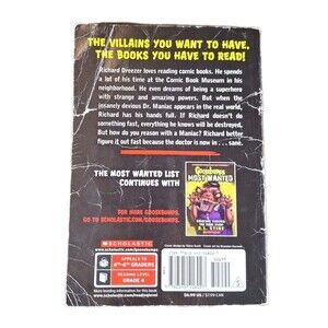 This book is part of the Goosebumps Most Wanted series and features Richard Dreezer, a comic book fan who faces the evil Dr. Maniac. Paperback published by Scholastic. The book shows signs of wear with creased covers and slightly bent page corners (see photos), but the interior pages remain readable and complete.