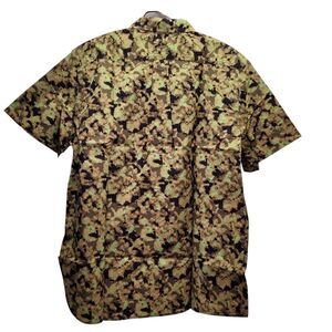 Goodthreads men's short sleeve button-up shirt in size XL. Features a green and black abstract camo-style print, button front closure, and a classic collar. Lightweight and comfortable great for casual wear.