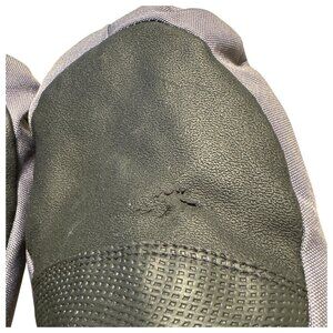Small scuff mark on one palm, see photo. Does not go all the way through, and appears limited to the outer palm polyurethane grip material/cover lining.