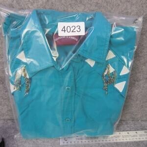 Features southwestern-inspired white embroidered triangle pattern and brightly colored beaded fringe on front yoke and shoulders. Classic button front with button cuffs. Solid turquoise blue color with no back embellishments except for a single white triangle accent below yoke.