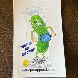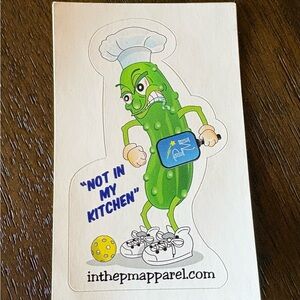 Colorful illustrated pickle vinyl waterproof decal with bold green tones. Playful angry pickle character holding a blue spatula. Bright and graphic design. Great for laptops, water bottles, and more.