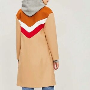 Notch lapels, long sleeves, contrasting chevron stripes at front and back yoke, seam pockets at sides, fully lined.